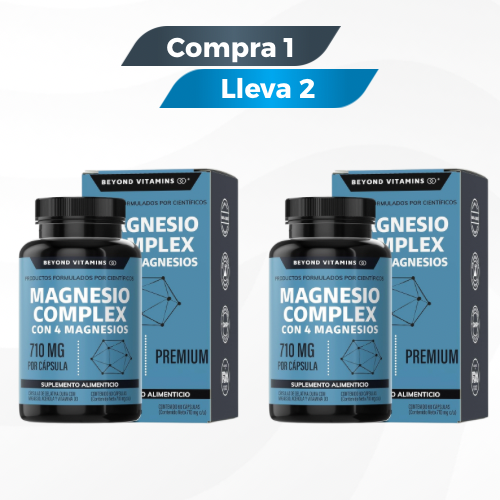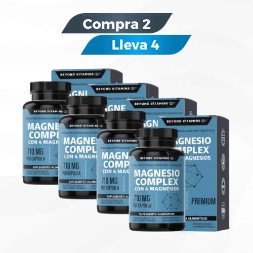 Magnesio Complex 4-en-1 (citrato, glicinato, gluconato y óxido) para apoyar músculos, sistema nervioso, relajación y descanso. Oferta: Compra 1, llévate 2 por $250 MXN con envío gratis a México.